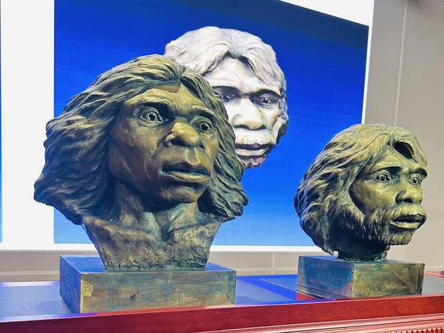 湖北省博物馆展出的1号头骨复原像、2号头骨复原像。