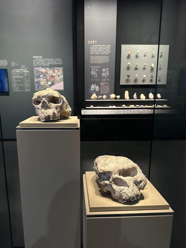 湖北省博物馆展出的1号头骨(右下)、2号头骨(左上)。
